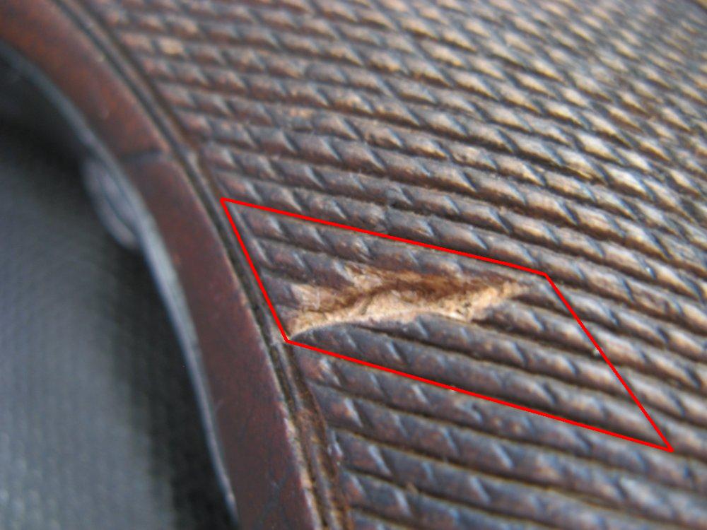 Интересный способ реставрации насечки, при возможности обязательно попробую. Хотя у меня был опыт восстановления подобных повреждений, только на ровной поверхности приклада и применял я эпоксидку и ореховую пыль. Остался очень не доволен результатом, пока дерево сухое все нормально, как только начал покрывать маслом все заделанные участки стали черными и контрастно выделялись на поверхности. Переделал зарезавшись штихелем вдоль волокон и вклеив ореховые вставки (подобрав по текстуре) стало лучше. Насечка конечно же очень хорошо маскирует подобные работы. Тем не менее, в Вашем случае, я бы выбрал более трудоемкий и кропотливый путь, выбрал бы зону насечки (обведено красным) на глубину повреждения и вклеил бы подобранный по текстуре и направлению волокон вставыш, подшкурил вставыш до высоты насечки и штихелем или изогнутым треугольным надфилем прорезал насечку. Две капли пропитки завершили бы работу. Да кропотливо и требует навыка, но оно того стоит.