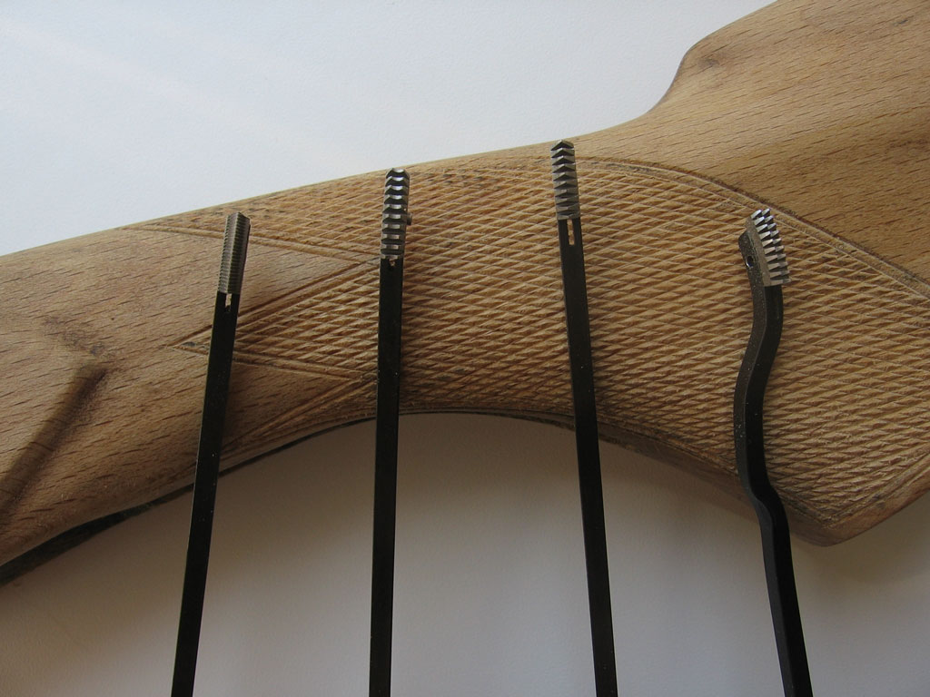 У вас очень даже приличный и, вероятно, дорогой набор. Левый резец,сами понимает, тот же надфиль. полностью пропитанное дерево резать смысла нет. ещё грязнее будет насечка. А вот когда планируется отделка шеллаком, тогда насечка делается уже на полностью отполированном прикладе. Шеллак не любит рваных движений и отделать приклад с насечкой толком не получается. насечка цепляет тампон. Точно так же и без затыльника(пусть даже технологического) не получается отделать заднюю часть приклада.