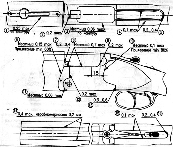 Клей использую 30минутный фирмы DoneDeal (не стоит пугаться, эти шприцы продаются в магазинах с автокосметикой). Спицы только бамбуковые! Они самые крепкие. Раньше грыз отцовские удочки. Теперь на помощь пришли китайские зубочистки.(Но не все они бамбуковые, надо смотреть) Диаметр их около2-2.5мм . Сверло заточил специально, чтоб как у всех сверл по дереву, центр выступал вперед.Очень удобно. Насквозь не пролетишь если с противоположной стороны прижать железячку. Носик сверла упрется. Но получится накол. Через который выходит лишняя смола и самое главное воздух, при заклейке. Цвет подгонять на торце бамбука тоже не сложно. Меня спасает простой бледный коричневый фламастер. Поставил точку и всё. Начитался много у вас про поднутрения. Никогда так не делал. И не совсем согласен с этими утверждениями. Например то же Блазер укладывает механизм. вывешивая щеки. Зазор между щеками и мех-мом. 0.1мм а вот на тройнике как раз всё и держится. Ну что Скажите С.В. Попиков совсем дебил ? не уверен. Иначе на одном F3 17 изобретений не запатентовал. (тройник это железка соединяющая верхнюю и нижнюю личины)Да и у Фаусти я такое встречал. Короче стройная теория про клин раскалывающий дерево, но я в неё не верю. Если нет достаточного упора в хвостовике. начинает отрывать нижнюю часть щек. Я считаю, что неграмотная осадка заводских прикладов порождает такой выраженный дефект.(сделка, сами понимаете) А что же мы в таком случае не говорим о влиянии минеральных масел(окисляющих целлюлозу). А ведь когда ружьё хранится стоя, масло как раз и стекает на этот хвостовик.Вот на всякий случай заводские зазоры.
