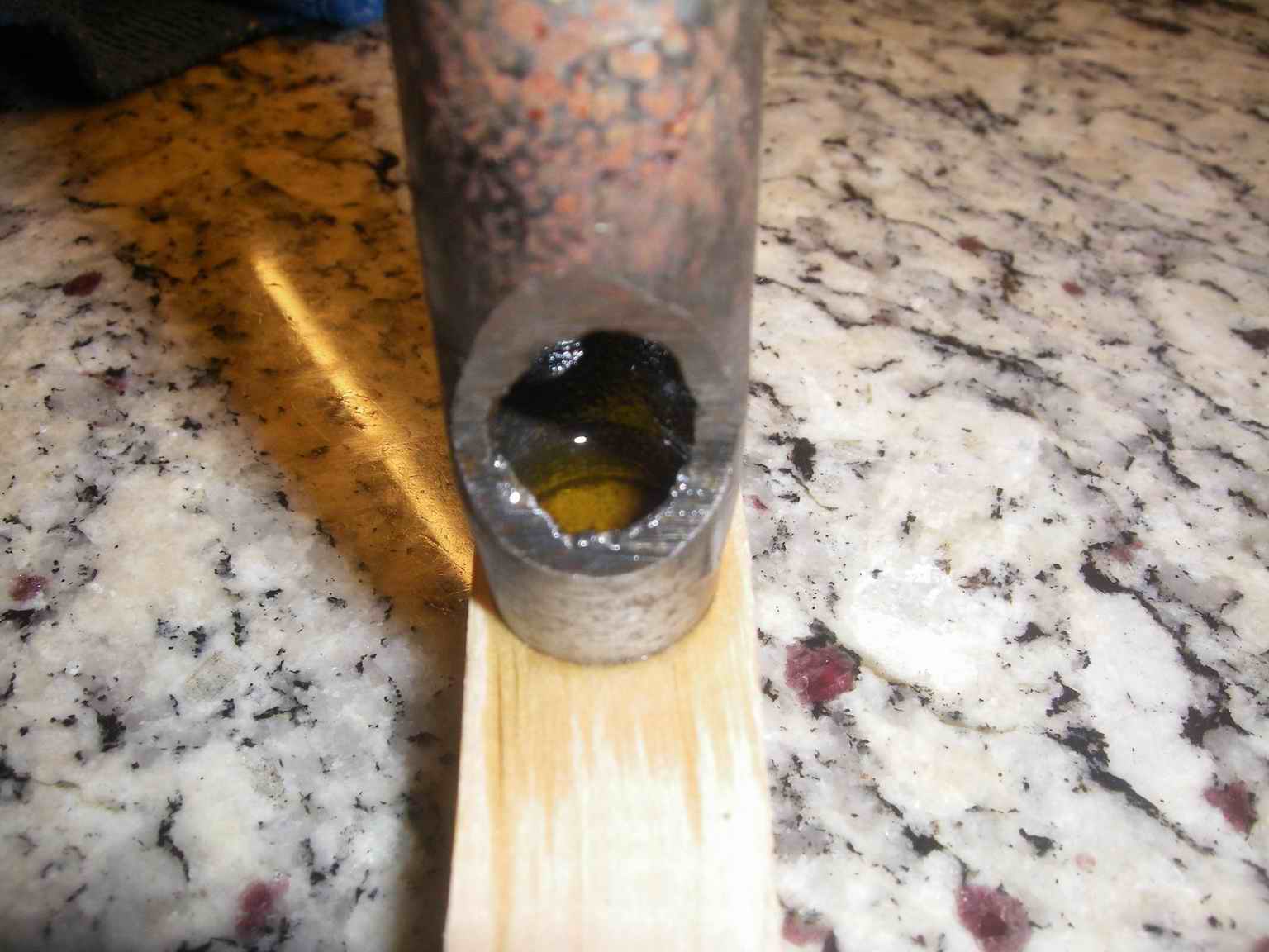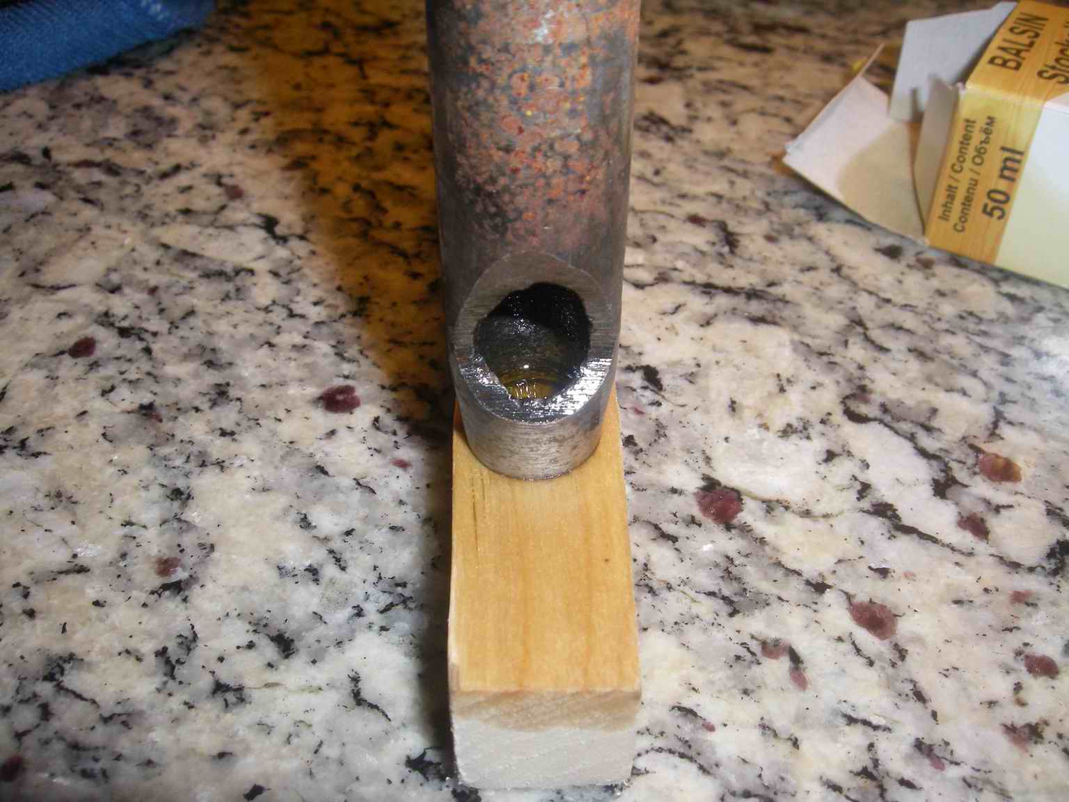 Загоняем высечку в дерево, заливаем в нее Шафтол - где-то мл 15-20 вошло.