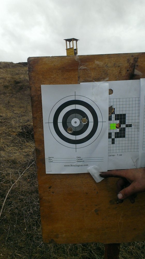 @fortowi68, Константин как и обещал скинуть и рассказать не много о пристрелки коллематорного прицела. Начнем по порядку, на Вашем сайте нашел мишени и распечатал их, у друзей военных взял попользоваться станок для пристрелки АК-74, правда он был не много не исправен. Дело в том что не фиксировался, приходилось прицеливаться по родной планке и аккуратно поднимать голову что-бы увидеть прицел коллематора. На это ушло довольно долгое время. Расстояние мишени изначально выбрал 50 метров, но потом передвинул на 40 метров, так как довольно далеко и плохо виделась точка мишени. Мишени были распечатаны на стандартном листке А 4. После настройки коллематора с горем опалам, попробовал первые выстрелы. Дальше больше... настраивается он довольно легко но с неисправным станком при выстреле видно срывал при нажатие на курок. Произвел 17 выстрелов пулей, коллематорный прицел не развалился и все с ним в порядке, чем меня и порадовал. По последней круглой мишени, уже стрелял без станка. Фото загружу ниже. Патрон 12/70 пуля ГлавПатрон. Честно сказать стрелять с ним одно удовольствие, 25 апреля открытие на утку, вот там его и испытаю по полному...