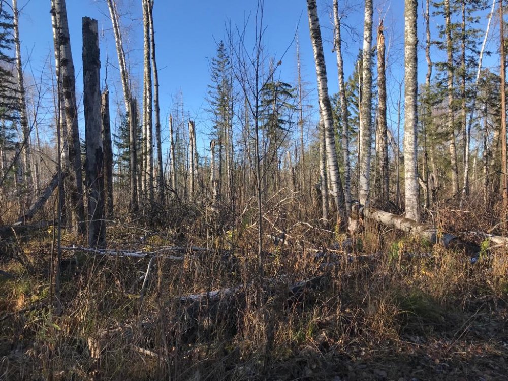К тому же тайга там завальная, сложно проходимая, поэтому поиск удобных мест сильно затруднен. Места эти я знал уже давно, когда еще лес был проходим. Но , к сожалению, лет пять назад шелкопряд прошел полосой и сожрал всю хвою. Вот они и падают, почти все уже упали, осталась береза и осина, но в отсутствии хвои ветер их ломает и получается вот такое: