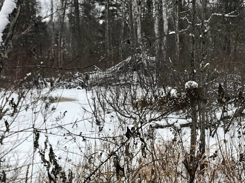Лед 2-3 см. Провел ЗМУ. ))) Немного страшновато, местами лед трещит, местами вода верхом через промоины ( ключи скорее всего). Лиса помогла, по ее следам безопасней. Она все обходит. Нашел хату высотой около 1м. , там же рядом и ветки . Под льдом пузыри и экскременты. Везде лед 2-3 см, здесь 10 см. Поставил "бабочку" ( осиновый кол с двумя капканами) в метре от хаты. По реке в трех-пяти метрах от хаты еще два на подвес с осиновыми палочками. Бабочка глубина +-2м, один капкан 70 см , второй 120 см. Первую плотину оглядел издалека ( снег , лед), ко второй (это их крайняя как оказалось) не пошел. Это моя ошибка. Там есть полынья,начинается от плотины в сторону хатки шириной метр. По длине пол плотины ( около 2.5 м). Свежие погрызы, свежие "меточные палочки". Там потом на проход поставил. К сожалению за две ночи ( уехал в четверг, но не успел поставить, стояли с пятницы по воскресенье) так никого и не поймал.( Зато нашел хату, нет не хату , а хижину моего профессора. Вот она :