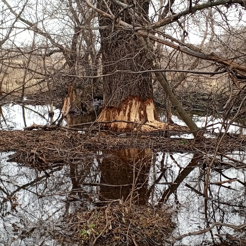 Перекрыли ручей,построили хатку,решили завалить дерево....Но есть вероятность ,если вмешается ветер,завалить это дерево прямо на свою хатку) Она слева за деревом.По следам от резцов,есть 20 плюс бобры по размеру.