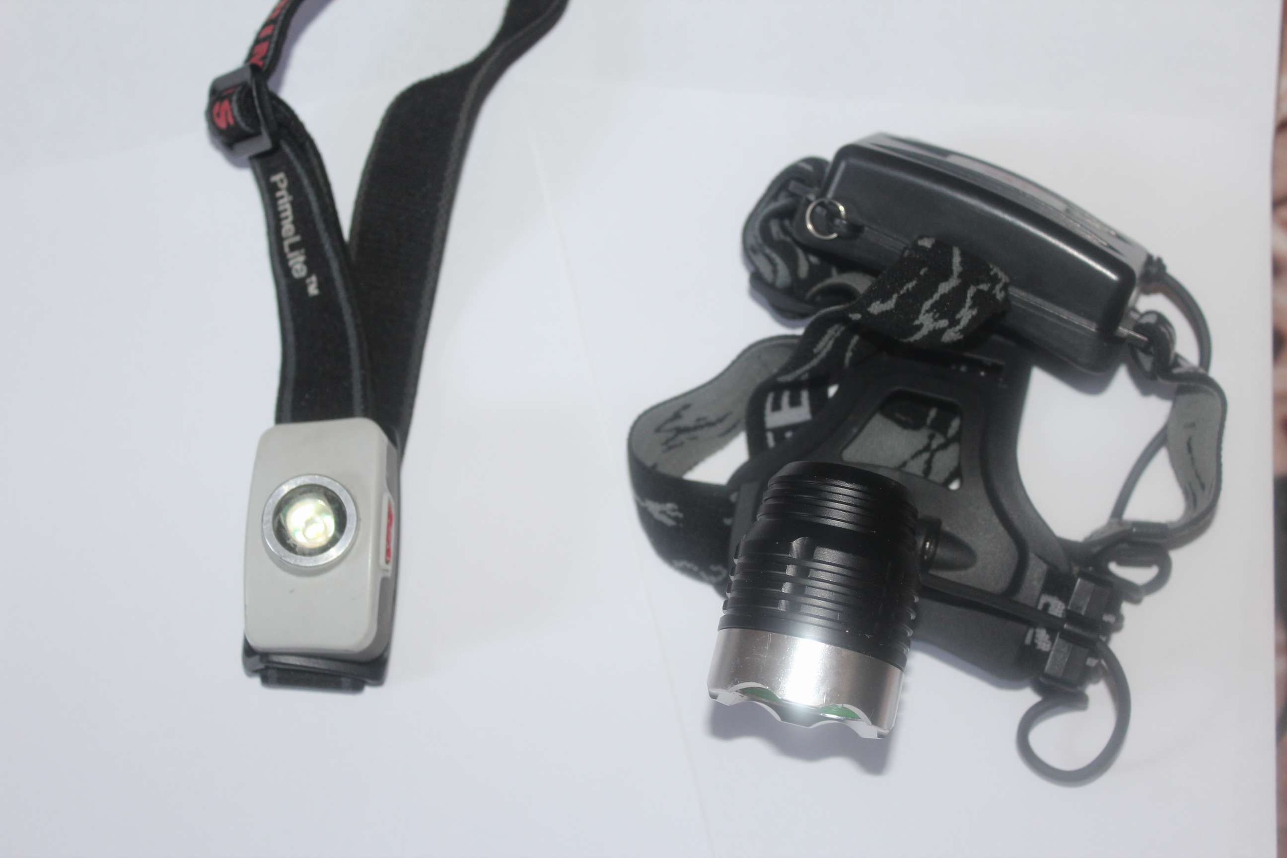 налобник от примуса на мизинчиковых батарейках, другой налобник на аккумах 18650, ясен пень что два аккумулятора на дольше хватает нежели двух батареек......но тем не менее первый очень не плох, режим держит один и тот же при вкл-выкл, второй же гоняет режимы по кругу....;
