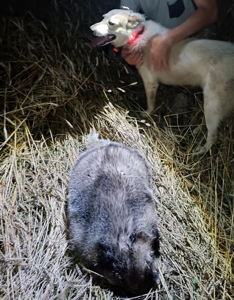 Добыли первого кобелька в этом году, барсук упитанный, больше 4 кг жира, несмотря на дату. Нашли в увале около 10 часов вечера, но уже успел пожировать - полный желудок пшеницы.