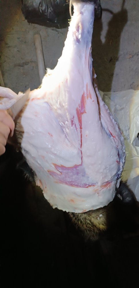 Еще не взвешивал, я его освеживал и подвесил заветриться, утром отец его забрал на разделку, а я на работу поехал. Внутреннего жира много, на вид больше килограмма