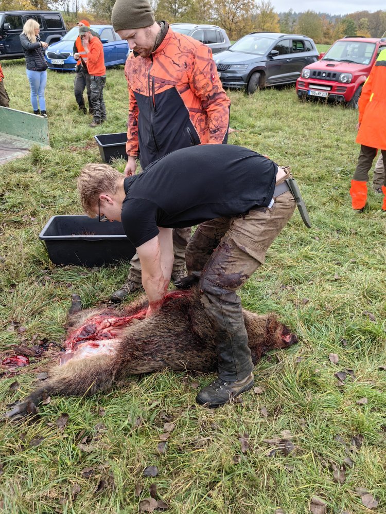 Добрый кабанчик Михаил, объясните и покажите юному Гансу куда надо стрелять и не будет рисковать остаться без шарандулов пока достреливает из пестика и дорезает ножом За ухо стрелять надо или в мозг, а не в самую крепкую кость на черепе. Выше глаза чуть правее одну треть высоты уха и будет падать как подкошенный, если передом стоит, то в лобешник ему, там где мозг небольшой переходик, впадинка есть, вот туда и надо ему бахнуть, тоже сразу с копыт рухнет. Череп не убойная часть туши, убойная небольшая зона в этом самом черепе Мелкашечная пуля при правильном и точном попадании выключает свет. Михаил, это тоже наверное больше традиции. Как по мне, то с карабина накоротке добрать куда сподручнее, чем играть в ковбоя и стрелять из револьвера. С собаками да, если злобные и контактные, которые висят на кабанах, то проблема и надо очень аккуратно. Ну так такие собаки и недолгожители, тем более в густом непролазном кустарнике до первого серьёзного кабана и в лучшем случае больничный. Мне доводилось добирать подранков в непролазных зарослях, стрелял в ухо чуть ли не прислонив карабин к голове. При доборе должна быть возможность стрелять с открытого прицела, в кустах оптика помогает как зайцу стоп-сигнал, наоборот только создаст лишних проблем. Кстати в таких местах гладкий рулит. Доводилось и дорезать в кустах, ну нахрен эти турниры с кабанами и соответствующими впечатлениями