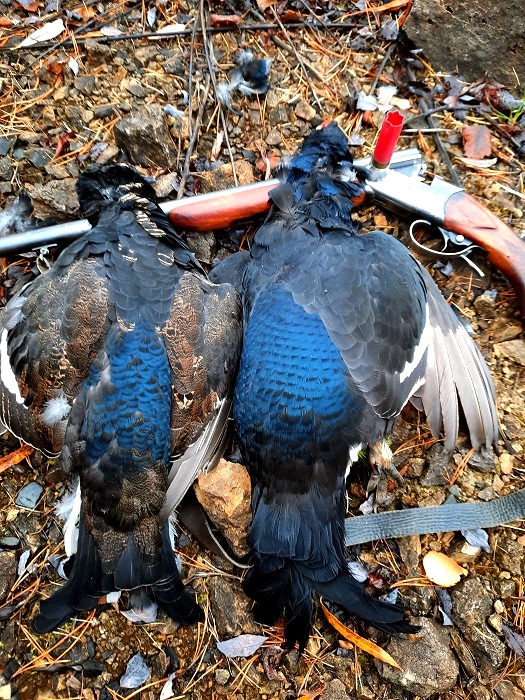 По работе ездил в одно местечко, кинул ружье. Впервые видел как рябчики сидели на обочине вдоль дороги. Стайки голов по 5-6. Улетали только когда подходил пешком поближе. На свист отзывалось сразу несколько. Но в дебрях только одного разглядел. Подбил его на земле.