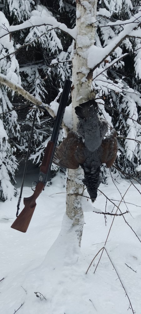 Выехал на пару дней в заветное угодье Еле пробился по полям на машине в лес, повезло, первый день был сильный ветер, взял с подхода глухаря, на второй как по заказу солнце и штиль. За весь день только раз на рябка наткнулся, самое интересное что самка стала откликаться, потом самец. К сожалению вылетела самка, понял уже когда добыл, самец улетел, сколько на рябчика охочусь самки никогда не подлетали, как то так