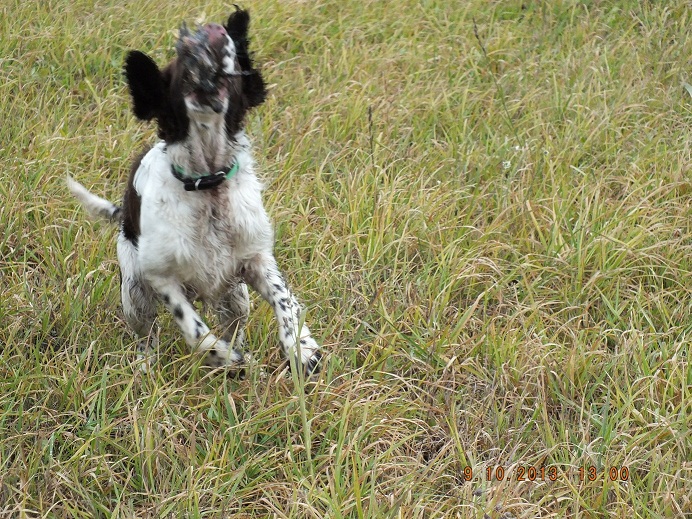Охота в мошковском р-не 9.10.2013г. перепел уже улетел на зимовку и встретить его в это время сложно.Собака практически сковырнула носом птицу, выстрел, подранок упал в невысокую траву, поиск несколько секунд. Подранок вылетел прямо из под носа Тори и был пойман в прыжке (к сожалению полноценное фото прыжка не получилось).