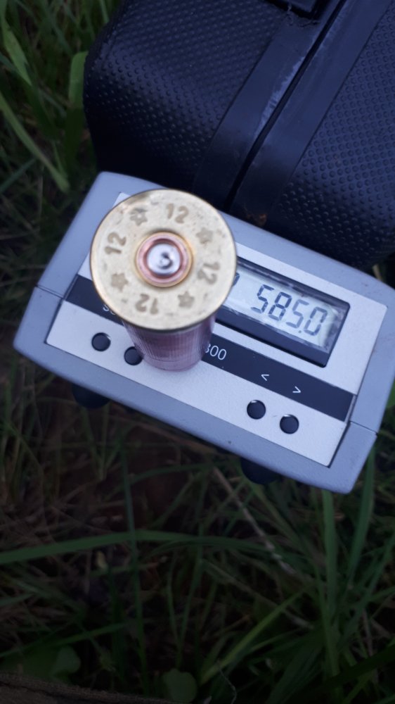 На фото- скорость /хотя теперь остановился на 550 мс на газоотводе/а разница со стволом без дырки в подборе порохов для тринара существенна/ . С газоотводом рецепт на медленных порохах у меня не заработал.