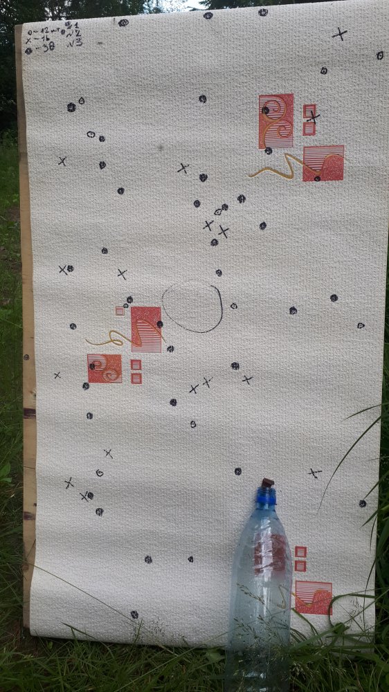 Подкину с разрешения Сергея фото его мишени . Стрелял он тринаром, расстояние 61 м. Скорость 575 мс. Дробь 3-ка. Мишень 1 мХ 1 м.