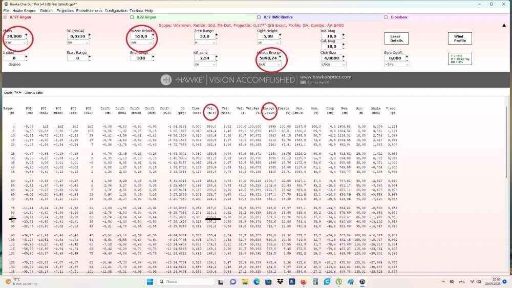 С калькуляторами, для которых нужен эмулятор - шляпа...Они не выдают нужные нам данные...Порылся в своих пневматических загашниках и нашел простенький калькулятор...Не знаю, насколько корректны результаты, поскольку расчёт для одиночной дробины, но сделал...Тут я уже и баллистический коэффициент включил...