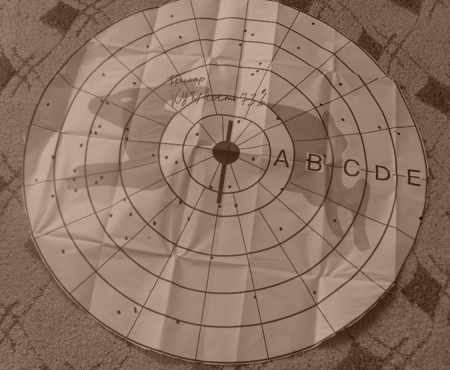 1. Равномерность осыпи. 37 поражённых полей - неудовлетворительная. При 63 шт. попаданий в мишень она должна быть не менее 45 полей. Есть соответствующие нормативы.