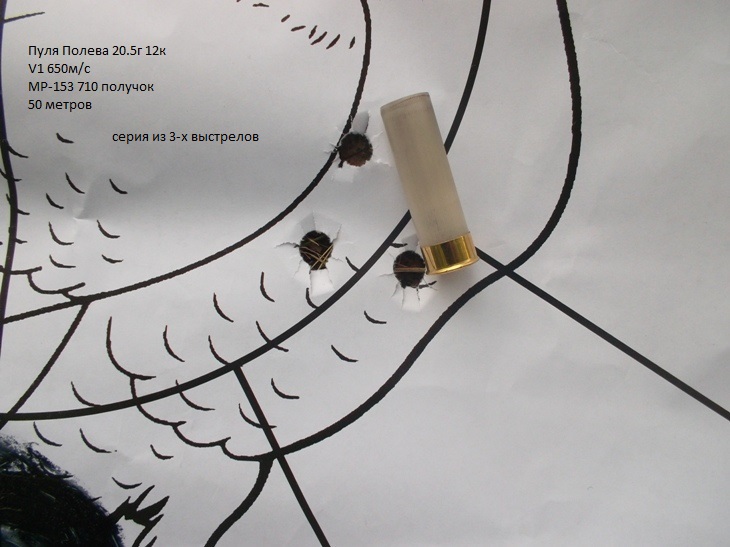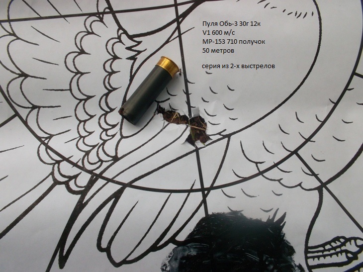 Отстреляли с Кислиным на кучность пули Полева 20.5г V1 650м/с (серия из 3-х выстрелов) и Обь-3 30г V1 600м/с (серия из 2-х выстрелов). Открытый прицел, сидя, цевье поджато в тисках. МР-153 710 получок. Дистанция 50 метров.