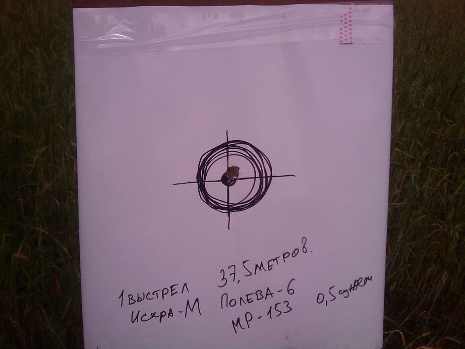 Вчера 2010.08.15 выезжали с товарищами на пристрелку оружия разными патронами Искра, Искра-М и пулевыми патронами (Гауланди) купленные магазинах города и на проходной завода. Дистанция пристрелки составляла 37,5метра (дистанция была выбрана на глаз, а после установки "щита" была замерена рулеткой). Хотел бы прокомментировать данное мероприятие. Пристреляли 3 патрона Гуаланди без прицела (цена 45руб. за патрон) Ложаться хорошо. Затем стрельнули с прицелом, и подкорректировали. Затем проверились. Считаю что пулевые патроны в Новосибирске, «Искра» может выпускать в большом объеме и по доступной цене и кучность будет ни чем не хуже. Даже если просто взять пулю Полева из магазина по розничной цене от 20 до 25 рублей за штуку и вставить ее в любой патрон за 12-14рублей, то цена будет 32-39р. Я уже не заостряю внимание на объемы и оптовые закупки. Фото ниже>