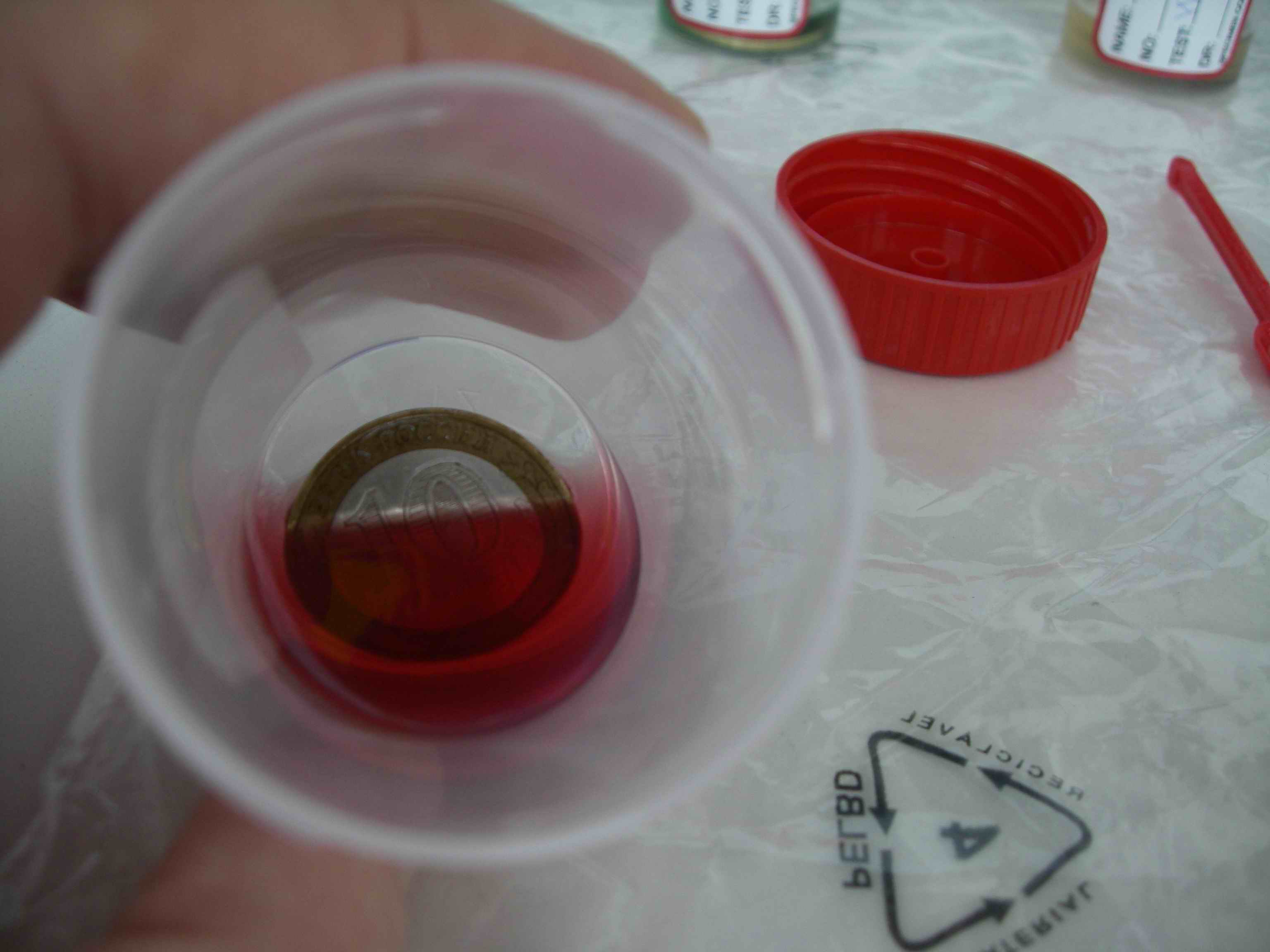 Ballistol. При рассмотрении - единственная монета, ободок которой стал значительно "светлее" от начала эксперимента. НО!!! - при этом само масло изменило свой цвет. Если первоначально оно бало прозрачное и ЖЕЛТОЕ - то теперь стало прозрачным, но СИНЕ-ЗЕЛЕНЫМ! С моей точки зрения - коли мути в масле не появилось, то это не "отслоившаяся грязь", а какая-то химическая реакция. Слышал я не раз, что это масло имеет немного щелочной состав (утверждать не бурусь) - но что есть, то есть! Кроме того, на ободе монеты "проявились" 3 каких-то "темных" пятна, которых раньше (смотрим исходные монеты) не было.