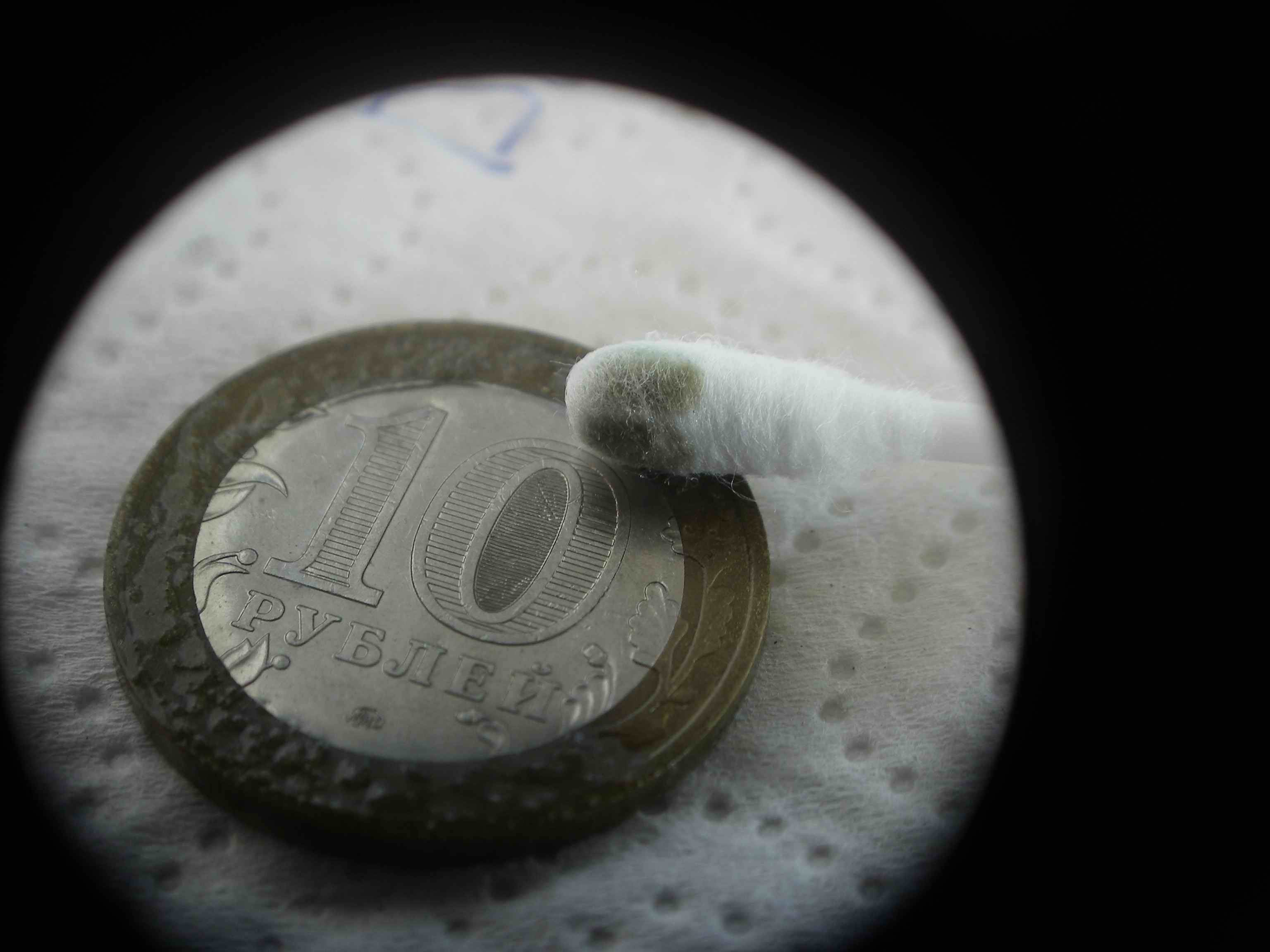 WD-40 - не успеваю фотать (не хватает третьей руки) - но на поверхности образуется тончайшая "сухая" корочка, но после ее "срыва" нижние слои достаточно быстро растекаются по поверхности монеты.