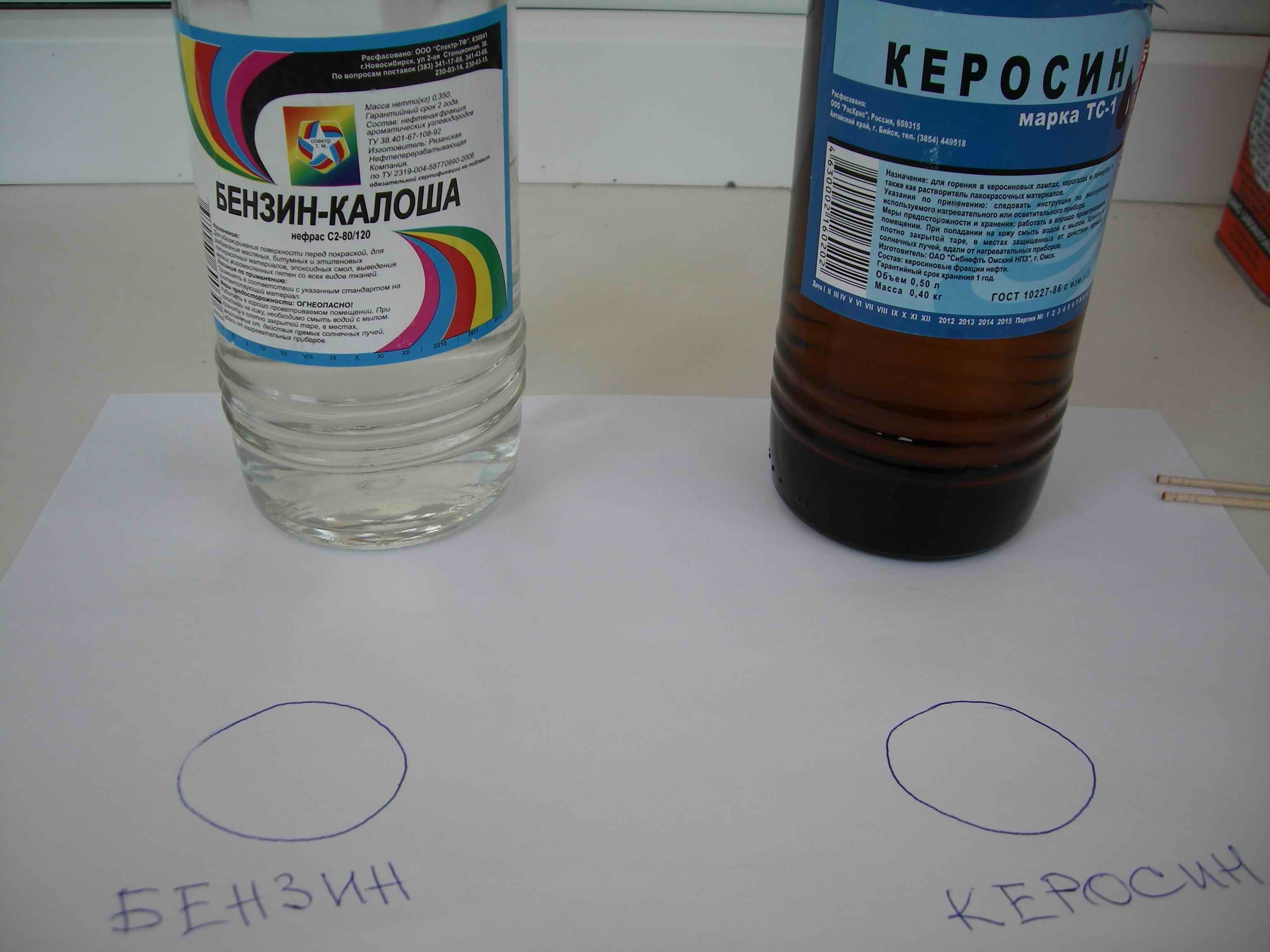 1. Берем лист чистой бумаги, бензин и керосин (чистые).