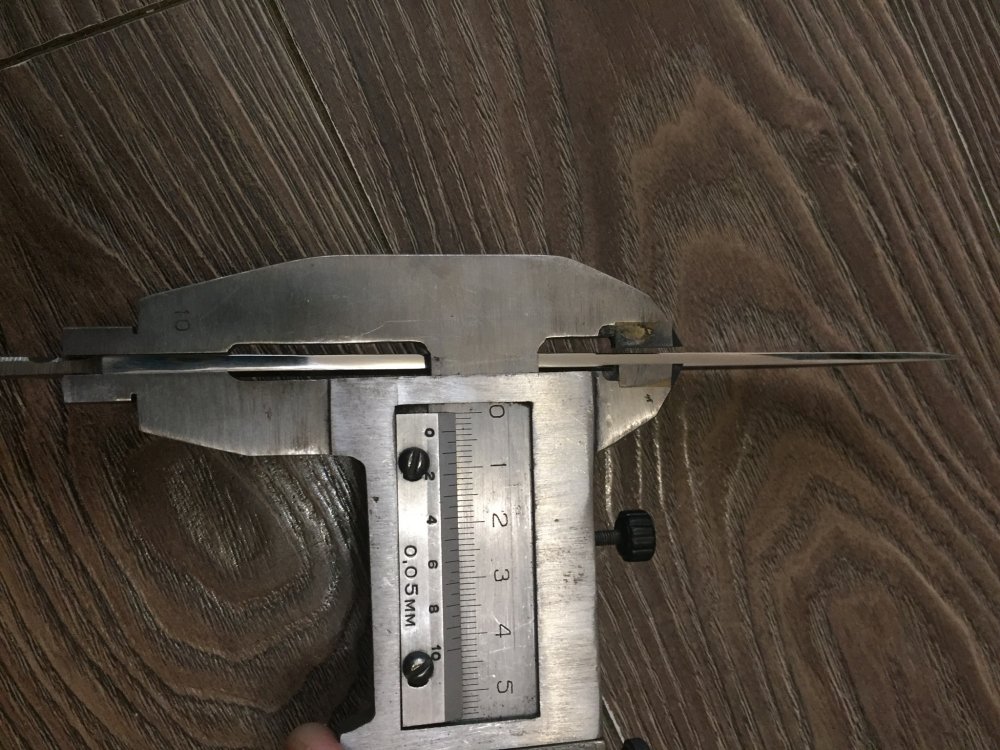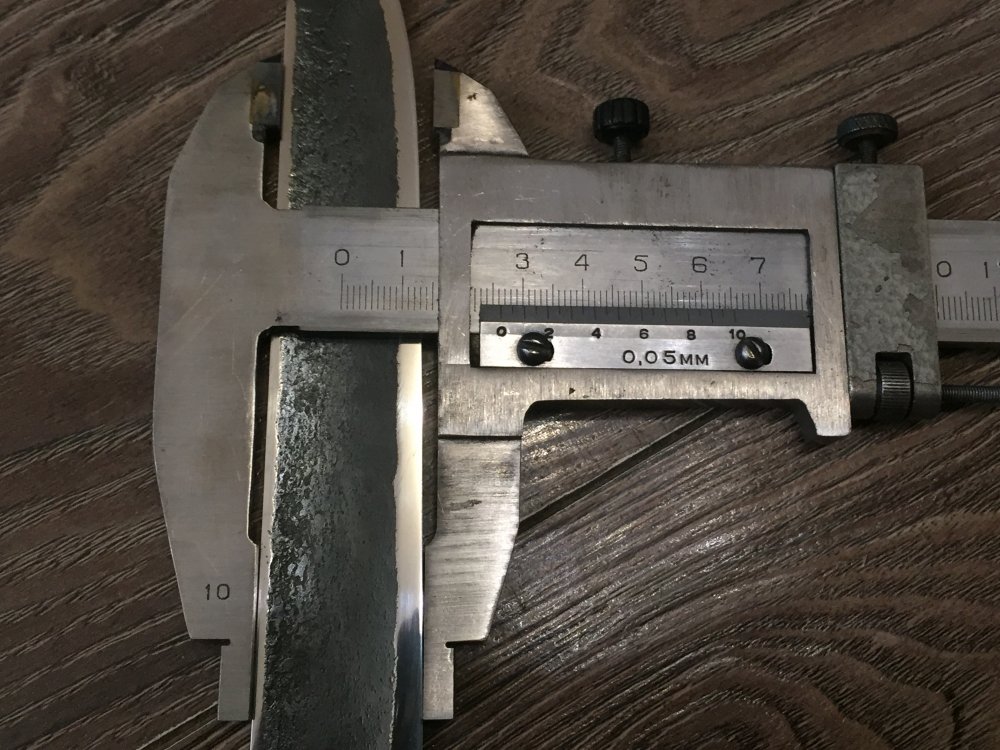 На обратной стороне клинка в верхней части есть следы ковки и это при толщине 2-3 мм. То есть клинок именно прокова при такой толшине а не тупо на наждаке ободран до такой толщины. Фото завтра сделаю чтоб вам легче было.