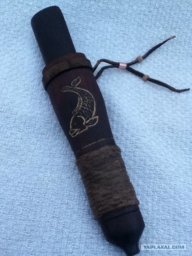 Ножны выполнены из цельного куска термоберёзы,методом долбления.В качестве декора использован пеньковый шнур,намотан и пропитан эпоксидной смолой, также есть гравировка в виде рыбы,с золотой патиной.Имеется кожаный подвес.