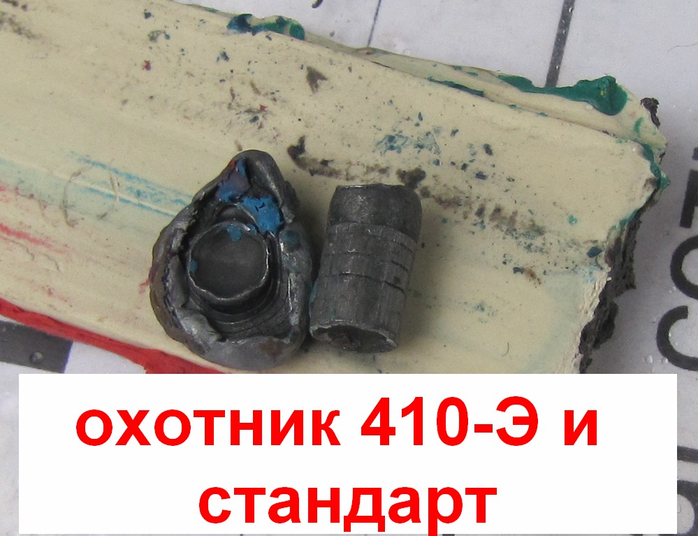 С точностью для Охотник 410-Э вроде понятно - для охоты вполне нормально. А насколько она экспансивна? Снял маленький ролик : https://www.hunting.ru/video/view/97663/ Тут кое что добавлю. Стреляя по пластилину экспансивная пуля прошла вдвое меньше (три дюйма) чем целевая с наиболее низкой скоростью из имеющихся у меня Стандарт (320м/сек). Но зато целевая практически не деформировалась, только носик притупился, а экспансивная пуля сложилась в лепёшку. НО!! Температура была около +10 и пластилин был не такой уж мягенький. Может и не твердый как деревяшка, но и не сравнить с кишечной областью дичи. Из известных источников: Экспансивные пули — пули, конструкция которых предусматривает существенное увеличение диаметра при попадании в мягкие ткани с целью повышения поражающей способности и/или уменьшения глубины проникновения. Соответственно, экспансивность — способность пули расширяться, увеличивать свой диаметр при попадании в мягкую среду. Поэтому решил выстрелить по воде в бутылях с 20м. Одну пятилитровую бутыль прошивали как целевые, так и экспансивные пули. Поставил за одной бутылью вторую и пуля остановилась в ней посередине между стенками (что хорошо видно на замедленном воспроизведении). Но пуля не деформировалась как в пластилине. И это при том, что пробила две стенки и крышку бутылей, что в общем то хорошее сопротивление в сравнении с водой.