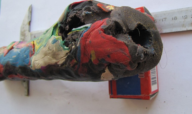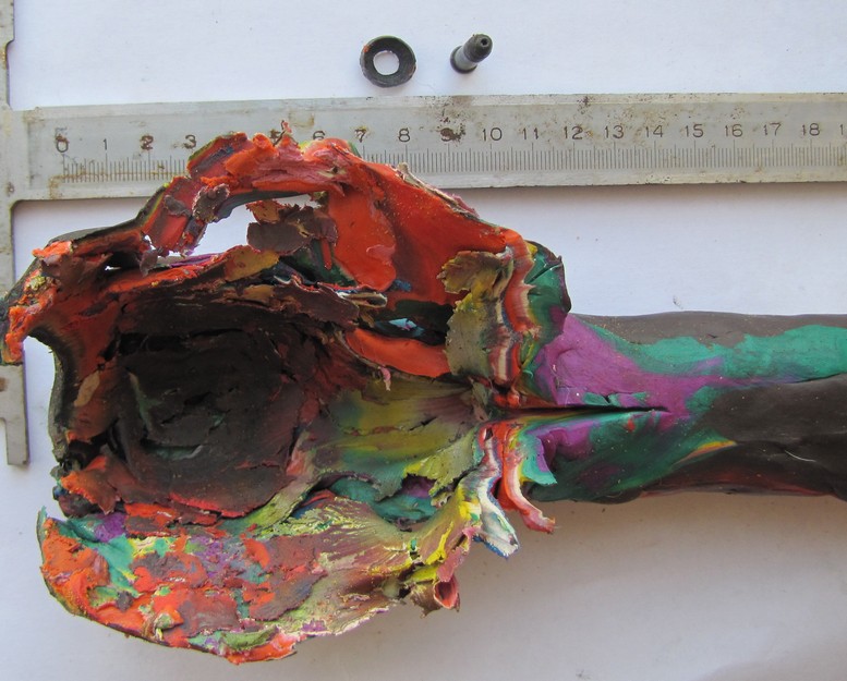Решил малость усовершенствовать августовский эксперимент по пластилину. Только не на холоде, а наоборот - температура пластилина была около +30. 1. Стрелял пистолетным патроном Силуэт1 (пуля 1,9г скорость около 200м/сек) Результат получился 22см и так как это был первый выстрел, то я засомневался, а хватит ли мне этого куска и его длины. Тоньше делать я побоялся , что вылетит пуля в сторону. Раневой канал для Силуэта получился от самого входа пули почти сразу одного уширения и почти по всей длине толще диаметра пули более, чем вдвое. Пуля не потеряла в весе ни изменилась в размерах. Фото1. 2, Немецкий RIFLE как я и думал прошил весь пластилин ровным раневым каналом (фото2) и с такой же толщиной, что у слабенького Силуэта, хотя немецкая пуля вылетает со скоростью 340м/сек и вес на почти грамм больше. Пулю я не нашел. Но стрелял я немцем уже в конце, поэтому все остальные выстрелы были без изменения формы и толщины пластилина. 3. Выстрел Фиоччи удивил уже при начальном осмотре входного отверстия (фото 3). При том же весе пули, что и немец ,а скорость чуть ниже (320м/сек) раневой канал получился в виде широкого утолщения от входа и далее пуля превращаясь в грибочек прошла заметно меньше Силуэта - 16см.Фото 4. Это утолщение как раз размером с тушку не большой птички и думаю рябчик был бы заметно разбит при попадании в грудку. Зато глухарю или мелкому зверьку такое утолщение было бы убойнее, чем прошило бы немцем.