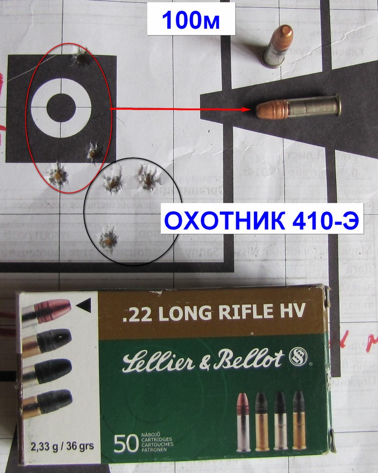 В общем то нормальная для целевых скорость 330м/сек и даже не сильный разброс по скоростям, а кучность хоть и хуже ОХОТНИКА 410-Э, но вполне нормально для охоты. Вот только для целевых пули прилетают в сторону , чем экспансивки. Поэтому для охоты придется использовать что то одно или не на дальние дистанции.
