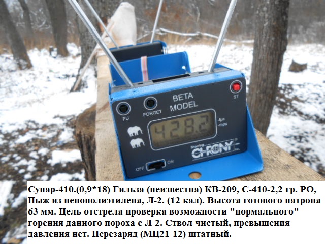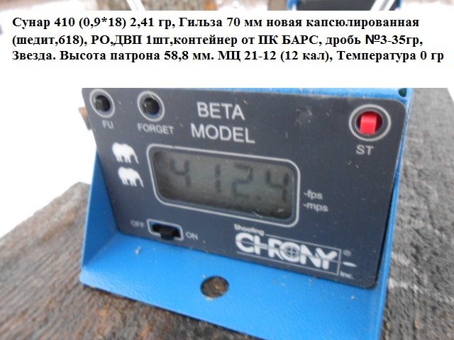 Условия заряжания испытанных патронов калибра 12/70: импортная пластмассовая капсюлированная гильза калибра 12/70, безконтейнерный пыж ' Biorientabile H 18' фирмы 'Гуаланди' Италия, дробь ? 3 (масса 33 г), первая часть порохового заряда из пороха 'Сокол' массой 1,6 г, вторая часть порохового заряда из пороха 'Сунар 42' массой 1,0 г. В результате отстрелов 20 штук патронов из баллистического ружья МЦ 1612 с измерением скорости полета дроби на расстоянии 10 метров от дульного среза и давления согласно методики по ОСТ 3246874 получено: средняя скорость 376 м/с и среднее максимальное давление в патроннике 648 бар. Важно отметить, что на штатных патронах при таком давлении скорость дроби составит только 325-330 м/с, т.е. примерно, на 16 % ниже.
