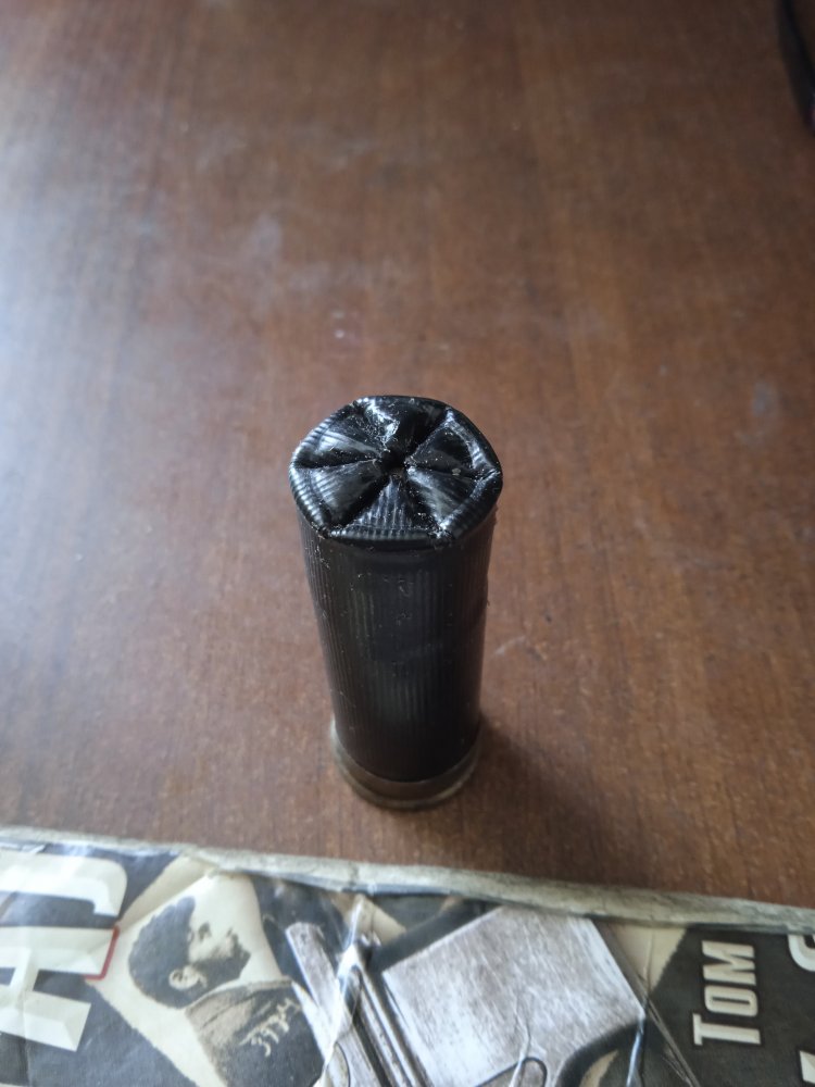 Валенок нарубленный или древесно-волокнистые или просто опилки прессованные и везде картонные пыжи элементарно подгоняются хоть под звезду,хоть под закрутку,потому что производится набор,а не из цельного "куска",который есть пыж,например н24био.Полиэтиленовые пыжи стаканчики еще со времен СССР я забраковал сразу и по причине плохой обтюрации зимой и применял древесно-волокнистые или опилки и первые под звезду(два пыжа и картонки),а опилки под закрутку,что бы выше была высота пыжей для лучшей обтюрации с картонками.Появились пыжи с очень хорошей обтюрацией,типа н24био и я их проверил зимой и остался доволен.35 граммов единицы или нолевки точно под закрутку.Фото.Порох Сокол,2,1 грамма,