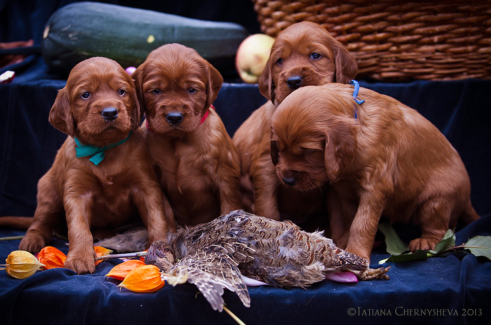 Второй помет от нашей замечательной проверенной мамы ИРэды - 4 девочки, рождены 13.08.2013. Все малышки очень упитанные и растут в довольствии. Мама Ирэда - дипломы 2 и 3 степени по перепелу Чемпион России, Украины, Белоруссии, РКФ. В этом году стала лучшим представителем породы на монопородной выставке ирландских сеттеров. Папа Роджер - диплом 2 степени и четыре диплома 3 степени дупель, перепел. Имеет международный рабочий сертификат! Чемпион Росии. Оба родителя имеют свидетельство о внесении в Всероссийскую Племенную Книгу Охотничьих Собак ( ВПКОС) Дипломы родителей предоставляем. Щенки с родословными РКФ. Помощь в выращивании, содержании и натаске Девочки обещают быть яркими, отличными работницами и с хорошим экстерьером. Отличный возраст, для начала работы с собакой в следующем сезоне. Сеттер может быть не только рабочей собакой, но и отличным компаньоном для жизни и спорта. Отлично ладит с детьми, прощает все шалости и терпит боль. Благородная и очень красивая собака! Предыдущий помет (сейчас два года): все имеют оценку экстерьера отлично, двое дипломированных фото мамы и щенков на сайте www. lucksetter. com