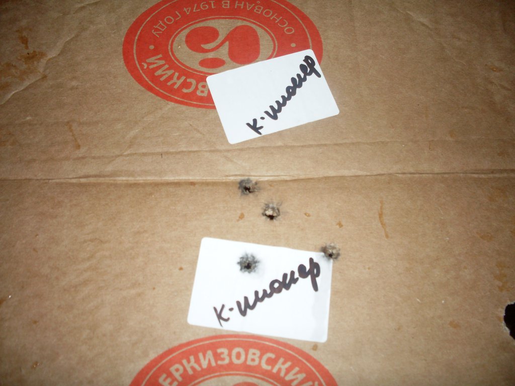 Сегодня закрывал сезон. Поехал в поле, взял последние 10 шт барнаульской экспансивки. Дистанция 120 шагов - около 100м. В поле снегу по щиколотку, шаги получились нормальные. Условия - ветер слева порывистый 6-8 м/с, снег с дождем, +1 градус. С упора лежа. Первые пять с чистого ствола. В первую мишень прилетело 4. пятый считаю унесло порывом ветра. Во второй мишеньке тоже 4 отверстия, но в противоположной стенке коробки я нашел 5 отверстий. В коробках был насыпан снег, по этому вылет 2-х пуль - плашмя.