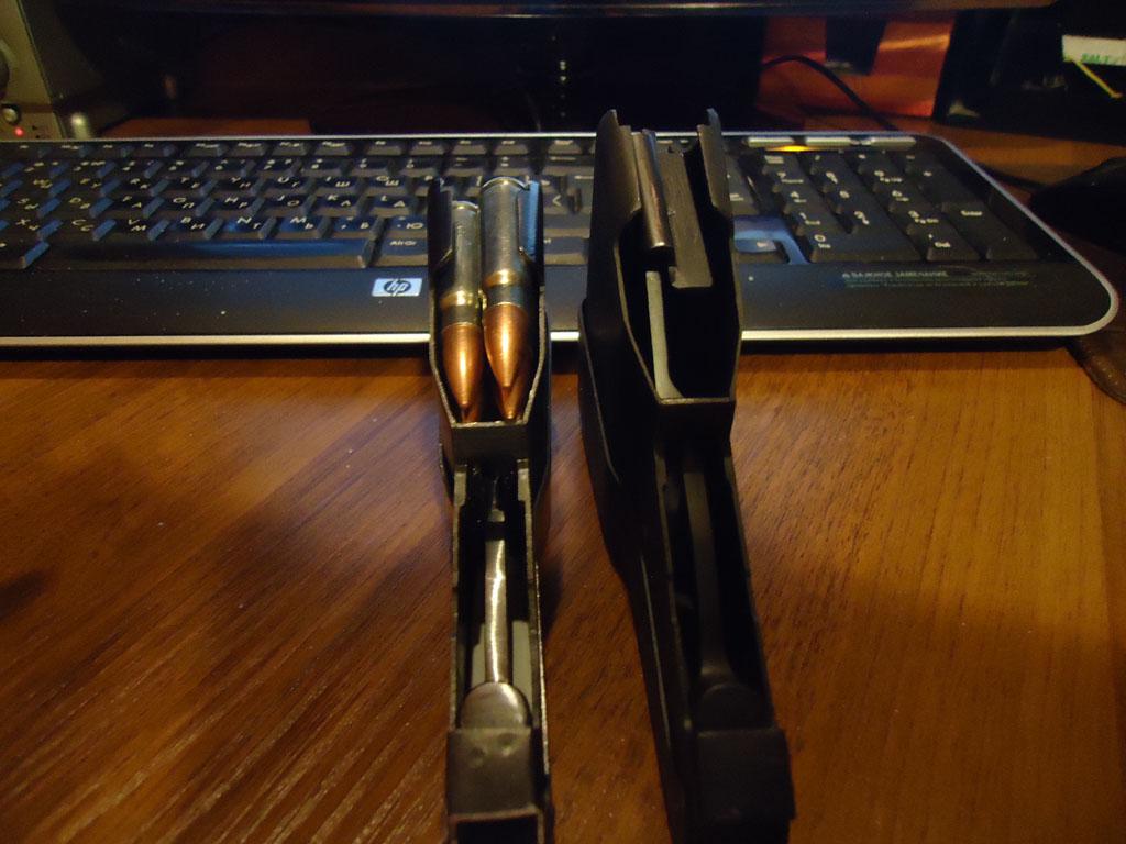 Это в момент, когда после выстрела затвор ушел назад и верхний патрон подался вверх до упора в губки магазина (на штатном магазине) под воздействием подавателя, вот тогда корпус магазина своими губками плотно прижимается снизу к ствольной коробке, и затвор поэтому закрывается без проблем... А при модернизированном магазине корпус и крышка магазина скреплены в единое целое, поэтому и нужно опытным путем подбирать место их скрепления.