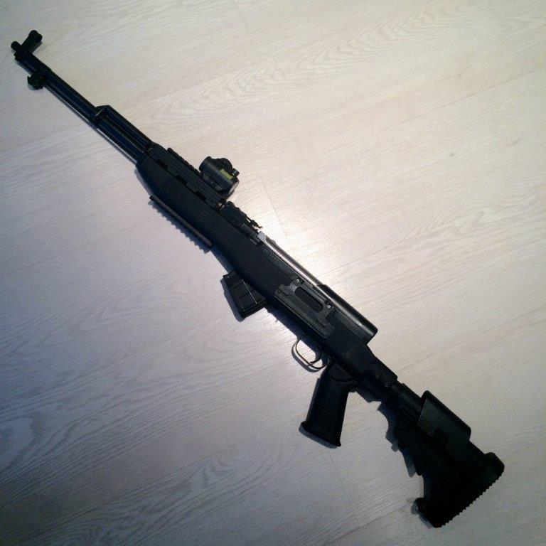Есть. Принимайте в ряды СКСоводов. Ложе TAPCO. Съемный магазин PROMAG на 5 патронов, есть запасной на 10 патронов. Коллиматор Bushnell TRS-25, на фото на цевье закреплен, но сейчас поставил на планку Пикатинни на родное крепление для оптики. По мишеням на кучность сам пока не стрелял, жду открытия чтобы в лес выехать на законных основаниях с оружием. Будут результаты по куче - выложу. Мнение о том что кучность падает - есть, проверим.