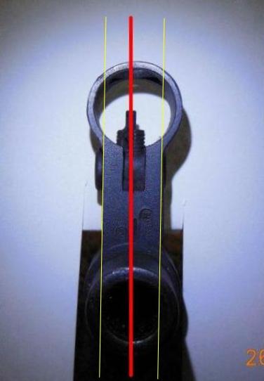 Если сильно напрягает, можно зажать основание мушки в тиски и попробовать стронуть в нужную сторону. Главное не перестараться, а то, если основание мушки сидит крепко, можно и шаг нарезов изменить. ;D