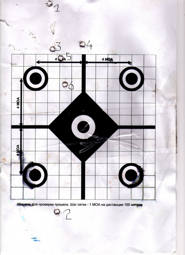 Вот как получилось (дистанция 95 м) при пристрелке ночника 1-2 точки чтобы только попасть в мишень(ночник вновь установленный) 3-4-5-6 окончательная "куча", которая меня устроила т.к. высота крона над осью 7см, не было целью свести ось прицела с осью ствола(поправка на ночь) у ночника и так есть метки (ласточки) 50м перекрестие, нижняя 100м, первая над перекрестием 25м, следующая вверх 15м. Тут какраз и показано как "химия" улучшила кучность. Стрельба велась с рук ,вес СКСа с прицелом 5 кг однообразного прицеливания не было (вскинул, навёл, стрельнул ))). Готовлюсь на грызунов, для этого всё и делал:)