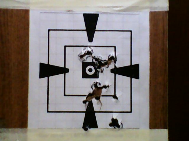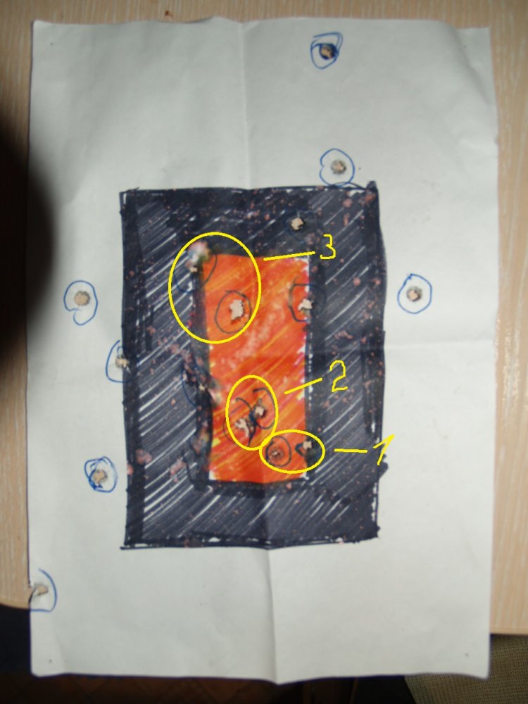 Давненько мишень выкладывал - желтыми кружочками выделены контрольные серии по 2 выстрела с открытого прицела предыдущей партией БПЗ НР (прицеливание - две серии под обрез прямоугольника, а третья - в середину оранжевого: я все оружие так с превышением пристреливаю...).