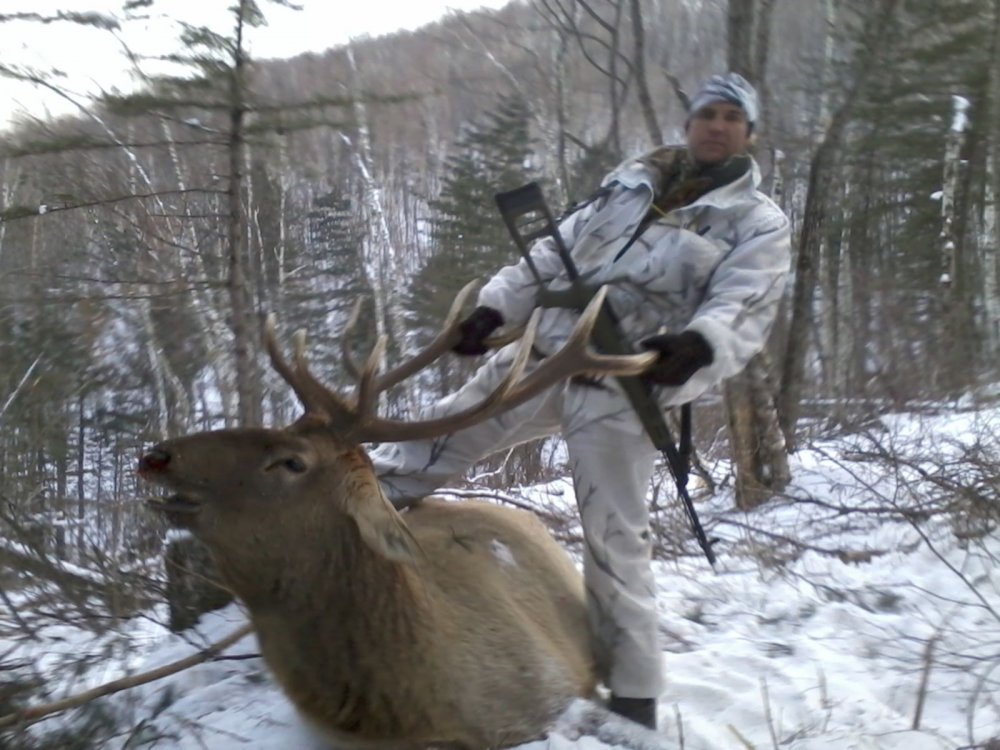 Кречмар большой спец по медведям-он всю молодость провел на Северо-Востоке и писал диссертацию по "михам"Знаком со многими промысловиками.СКС с "пиленными" боевыми основной инструмент был(один спец добыл больше 150 зверей).Михаил книгу выпустил,-"Север и оружие".Что такое,что давало такой шанс охотнику ?Чистая местность,самозарядность и надежность,серия(как правило)на 70-120 метров.Вот огромного лося(самый большой размах рогов оказался на выставке) взял его друг из Сайги охотничьей(сестра СКС-52 см ствол,патрон 39-й,магазин отстегивается и в этом плюс против СКС(сейчас и на СКС такие магазины в продаже)).На фото Михаил рядом (дистанция метров 90(примерно,поясняет Михаил)).Местность характерная для Колымы.