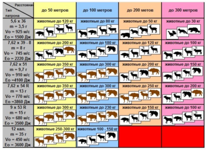 Дистанция рулит(энергии до сотки еще о кей).Серия усиливает(а уж это быстро 39-м,бесспорно).На сотке,а тем более дальше,39-й по энергии "обставляет" 12-й."Шило" не применять(только птички,пушнина) .Таблица вполне "жизнена"-(энергия в кгм должна быть равна массе животного(экспансивка),разумеется в убойное место,а если еще "парочку" пуль добавить?)