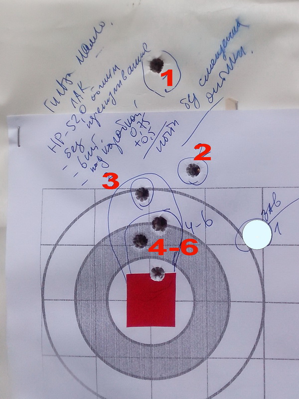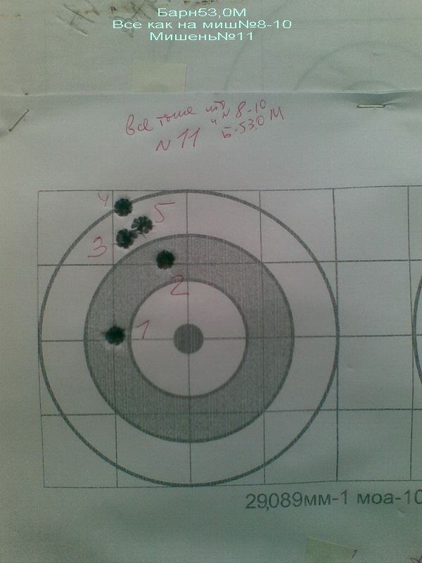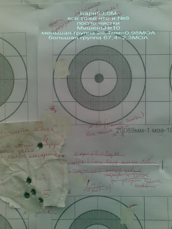 Саша, есть мысль как это сделать Я смотрю никто кроме меня не делал такие тонкие настройки СКСу, как музыкальному инструменту. Если в прошлом году все было спонтанно чисто на интуиции, то теперь уже обоснованно по напряжению и работе системы целиком. А что если сделать ровно полторы минуты напряжение Как это сделать уже сварилось в голове. А потом попробовать еще и 1 минуту, если с 1,5 заработает. Но чем меньше, тем верхние кучки будут нестабильнее. Надо увидеть этот предел. И тогда точно выясним предел возможности карабина. Сейчас уже нарисовалась картина почему лучшие карабины стреляют в две минуты, а кто нибудь пробовал настроить на 1,5 и 1,0 минуты как предлагаю я Думаю что - НЕТ В любом случае предел патрона из 8см диаметра разбросов по максимальным эксцентричным отклонениям теоретически возможно тока пополам сократиться, а это 4см. Дальше наверно уже нет. Даже вертикальные строчки рисуются под стабильные 1,5 минуты шириной. Это и есть подтверждение моих доводов. Так как на Ганзе от поставленных таких вопросов: "Почему карабин рисует эксцентричными в пределах 8см/100м пулями вертикаль с шириной в 4см?", и "Почему вертикаль имеет у хороших карбинов с военной ложей пресловутые 2минуты(6см/100и) с теми же пулями?" - ВСЕ СЛИНЯЛИ Я уверен, что нашел правильные ответы. Вот пример: на мишени все шесть легли в вертикаль. Она получена сразу после перемены напряжения системы с 21см/100м на 6см/100м на военной фанерной ложе. Система подвергалась частичной разборке(отстегивалось УСМ и приподнималась ствольная коробка на 2мм). Видно как с каждым разом все усаживалось на место, но самое главное я просто теоретически не мог сорвать ДжекПот по шесть из шести эксцентричным выстрелам. То есть так что бы все смещения попаданий легли строго вертикально вверх. Значит это обеспечивал только карабин Други, обратите внимание на ширину рассеивания. Там меньше минуты