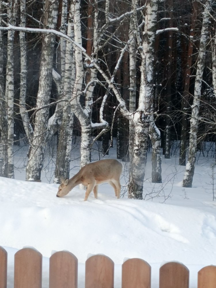 сейчас потеплело, полегче им стало, уже по несколько штук к дому не приходят, но одна постоянно и днем, и ночью у ворот на сене, спугнут ее, 2-3 часа в сосняке полежит и опять идет питаться..