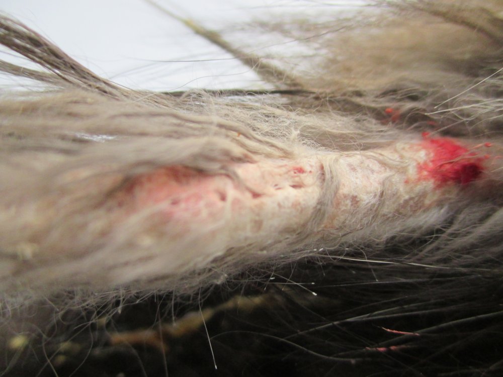 Тоже нынче попадался с таким же пятном, только расположенным ближе к хвосту. Думал, что дерматозный - оказалось нет, чистая мездра, пришлось вырезать этот дефект. У моей собачки черного цвета, клещи нагрызли лоб и морду и в местах укусов(один напьется, отвалится и другие клещи повторно впиваются в эти же места с анестезией, чтобы собака не чувствовала боли). И вот сразу из мест укусов(коростов) повыростали белые пучки, с которыми она ходит уже 2 года.
