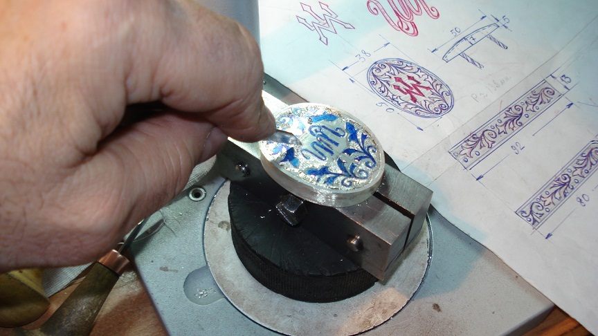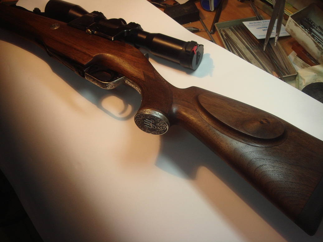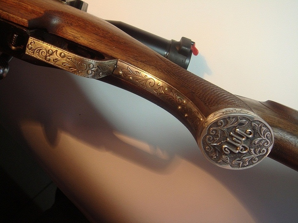 ...ошибаетесь...) На мосинке Агарина я делал тоже серебро, но там еще и золотая монограмма с мелкими бриллиантами, а здесь совсем другие инициалы владельца "ШМ", и только черненное серебро, с рельефной гравировкой по немецкому стилю...