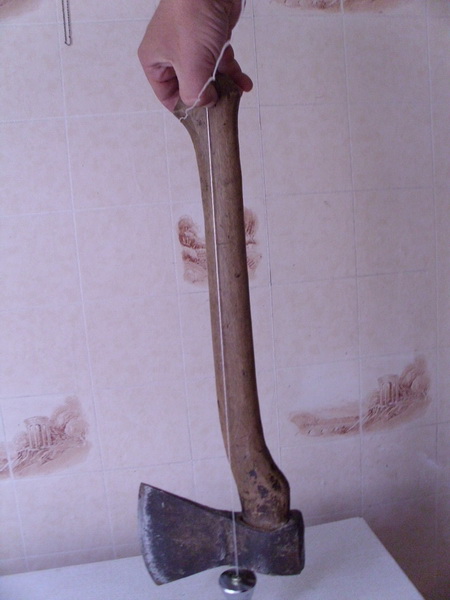 Дальше уравновешиваем топор на какой-либо опоре, я использую просто палец. Чтобы топор висел на нем точно горизонтально. Отмечаем ещё одну точку. В месте пересечения оси вертикали и горизонтали и будет находится фактический центр тяжести.