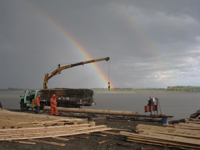 Лес , по большой воде , так же сплавляют . Собирают смытые деревья и на пилораму . Тоже ленточками пилим .