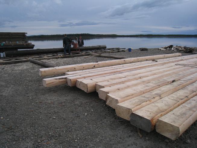 Ель в лесу до трелевки;часть плота;разгрузка бревен уже в родной деревне,100+ миль ниже,из воды прямо на примитивную ленточную пилу,окориваем до распила,т.к.вода в Юконе летом это каша из ледниковой пыли;все пилим в лафет.