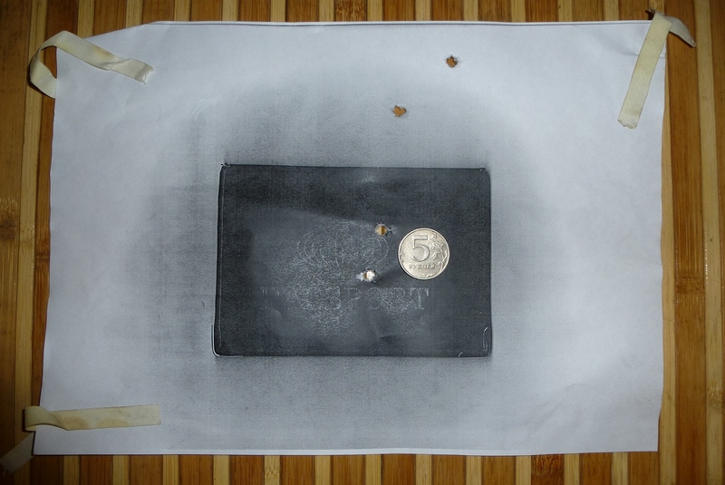 Вот результат, на сто метров из окна праворукой машины с упором левой руки на боковое зеркало, верхние пару дырок перед последней поправкой.