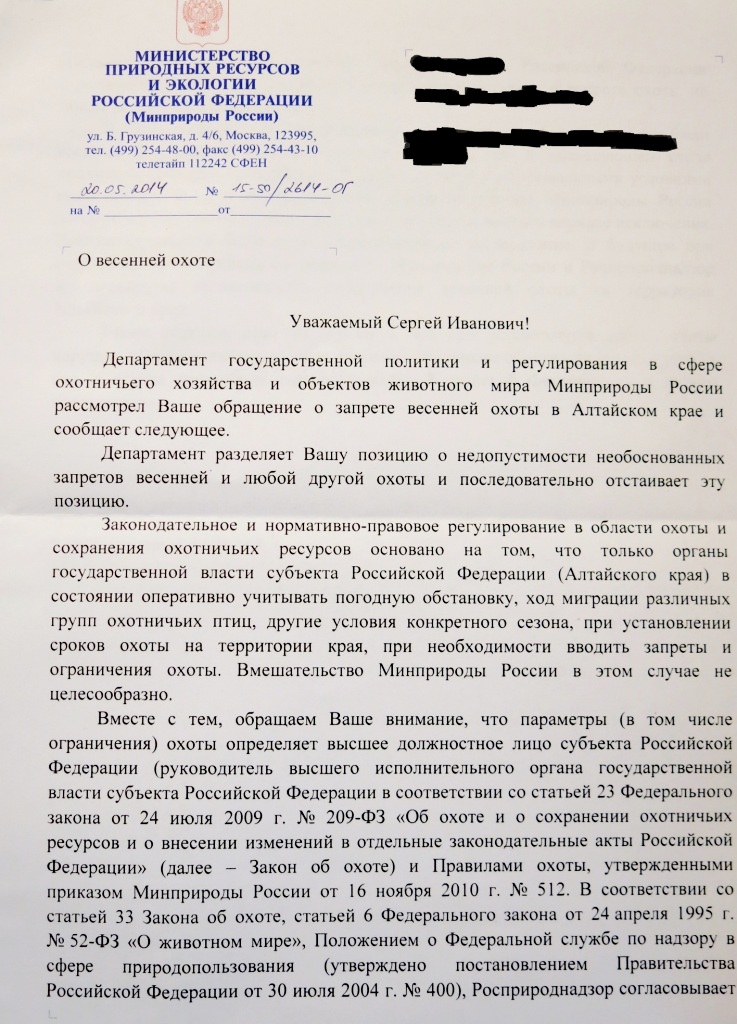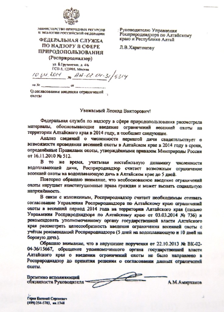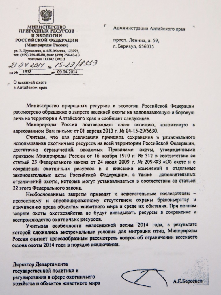 Если бы причиной отказа было названо отсутствие на тот момент вступившего в силу постановления о запрете весенней охоты 2014 в Алтайском крае, то было бы все ровно у них и не было бы шанса чего либо добиться. Короче, думайте, решайте, алтайцы. :-\