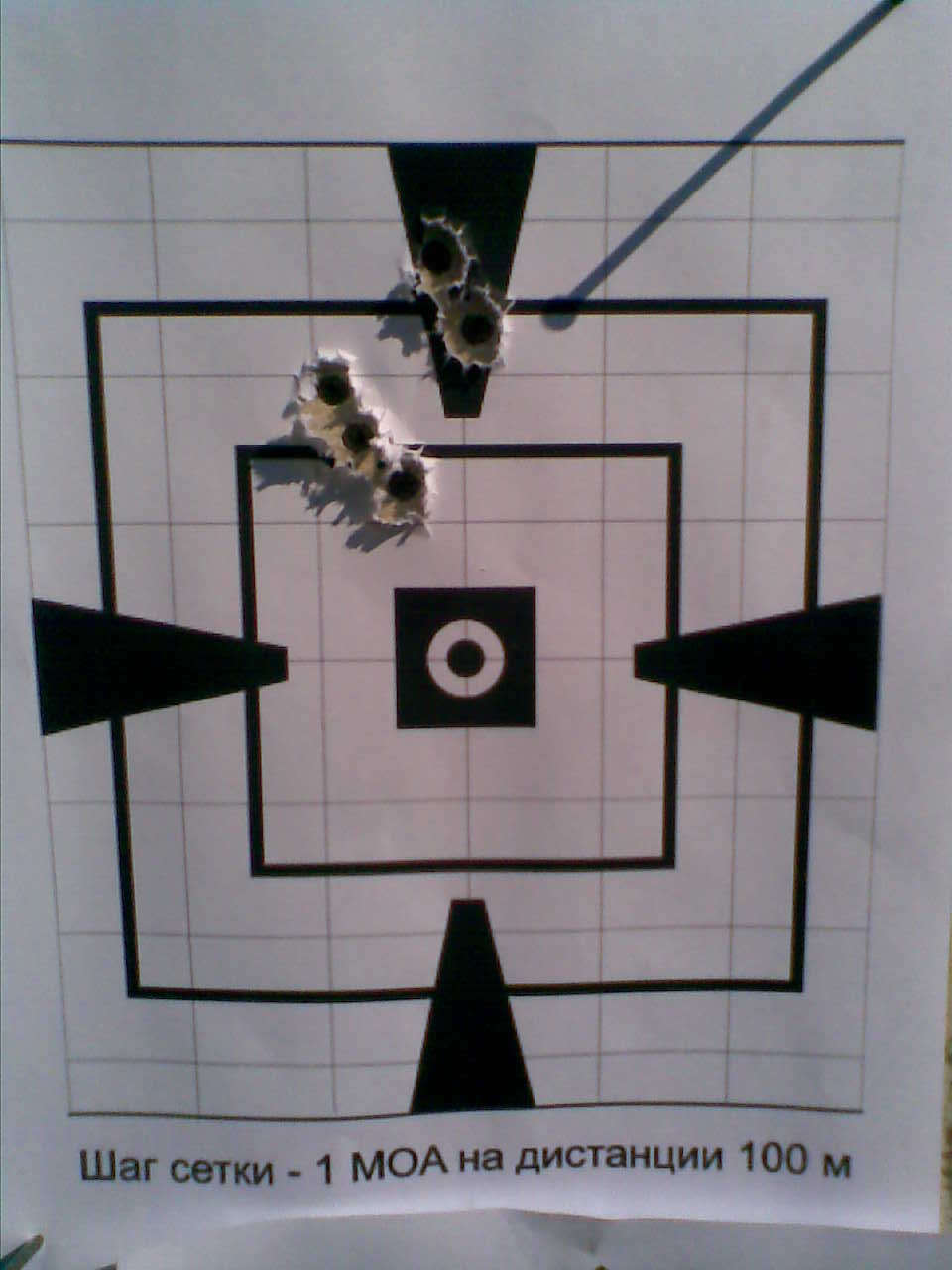 В вскр выезжали втроем на пристрелку моего Суперсвина и СКС корифана. Пытался прибить прицел на 150м, но ничего вразумительного не достиг - все трясется, все дрожит. Станка нет, стрелял с походного столика и спальника. В А4 пули ложились, но то правее, то левее. В общем, более менее подвели прицел. Затем, я решил с "вроде прибитого на 150м" сделать финальную серию из 5 выстрелов на 100м. Перегнал машину, лег всем телом на капот, карабин на спальник и вот результат: Пы Сы. Решили так и оставить, получилось стп ушла вверх на 2моа.